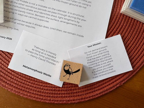 A monthly, tangible practice delivered by post. Letters, prompts, and seasonal invitations designed to slow you down, reconnect you to nature’s rhythms, and give form to inner change in a disembodied world.